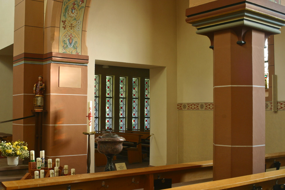 Das Langhaus der Kirche besteht aus einem Mittelschiff und zwei Seitenschiffen und hat eine Länge von 18 Metern und eine lichte Breite von 13 Metern. Das Mittelschiff hat eine lichte Höhe von 10,30 Metern, während die Seitenschiffe 5,50 Meter hoch sind. Nach einer umfassenden Renovierung wurde der Innenraum der Kirche 1958 von dem Künstler Paul Grimm neu gestaltet. Die Seitenaltäre "Abendmahl" und "Maria Himmelfahrt" stammen aus dem Jahr 1780 und wurden ursprünglich für den Limburger Dom hergestellt. (Bilder © grafikdesignklein.de)